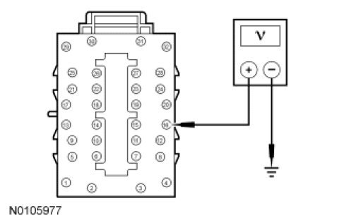 - Measure the voltage between SJB C2280D-16, circuit CBP41 (BU), harness side and ground.