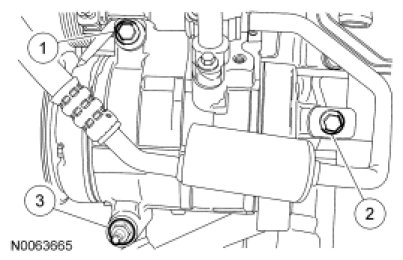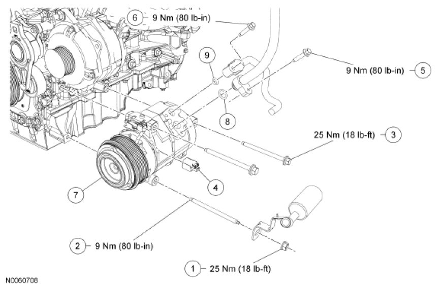 8. Tighten the A/C compressor bolts and nut in the sequence shown.
