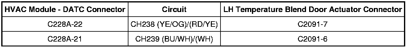 - For DTC B226C, measure the resistance between the HVAC module - DATC connector, harness side and LH temperature blend door actuator connector, harness side using the following chart.