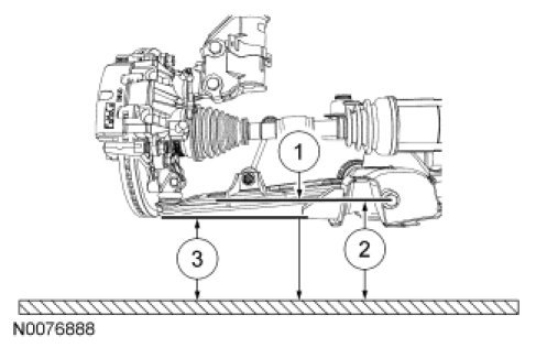 1. Measure the distance between the same flat level surface and the center of the lower arm-to-subframe bolt (measurement 2).