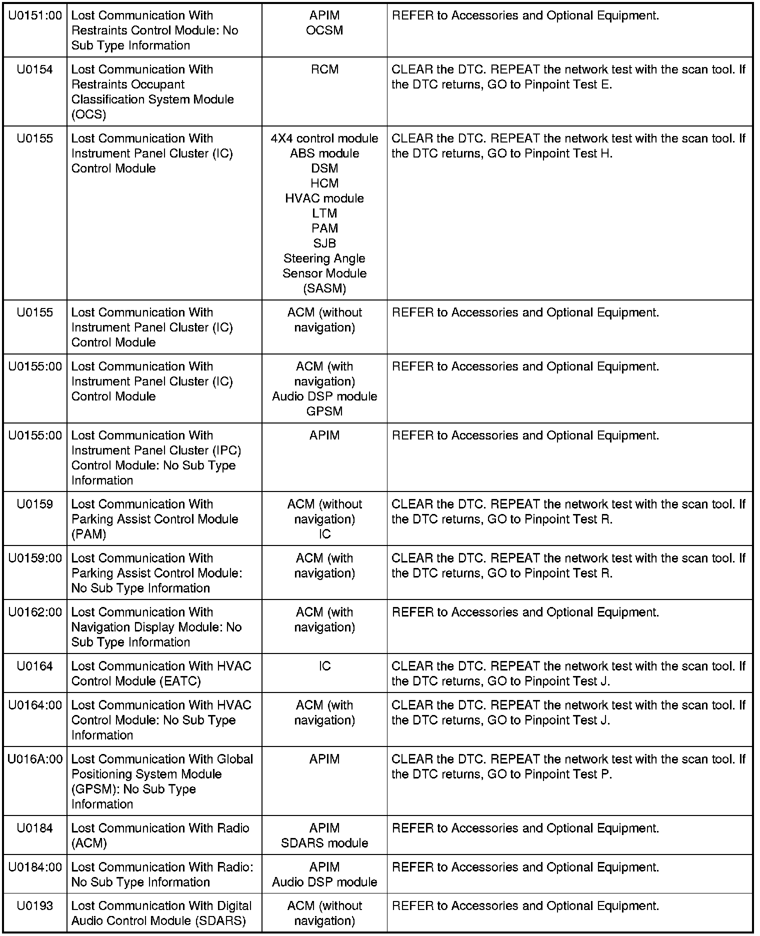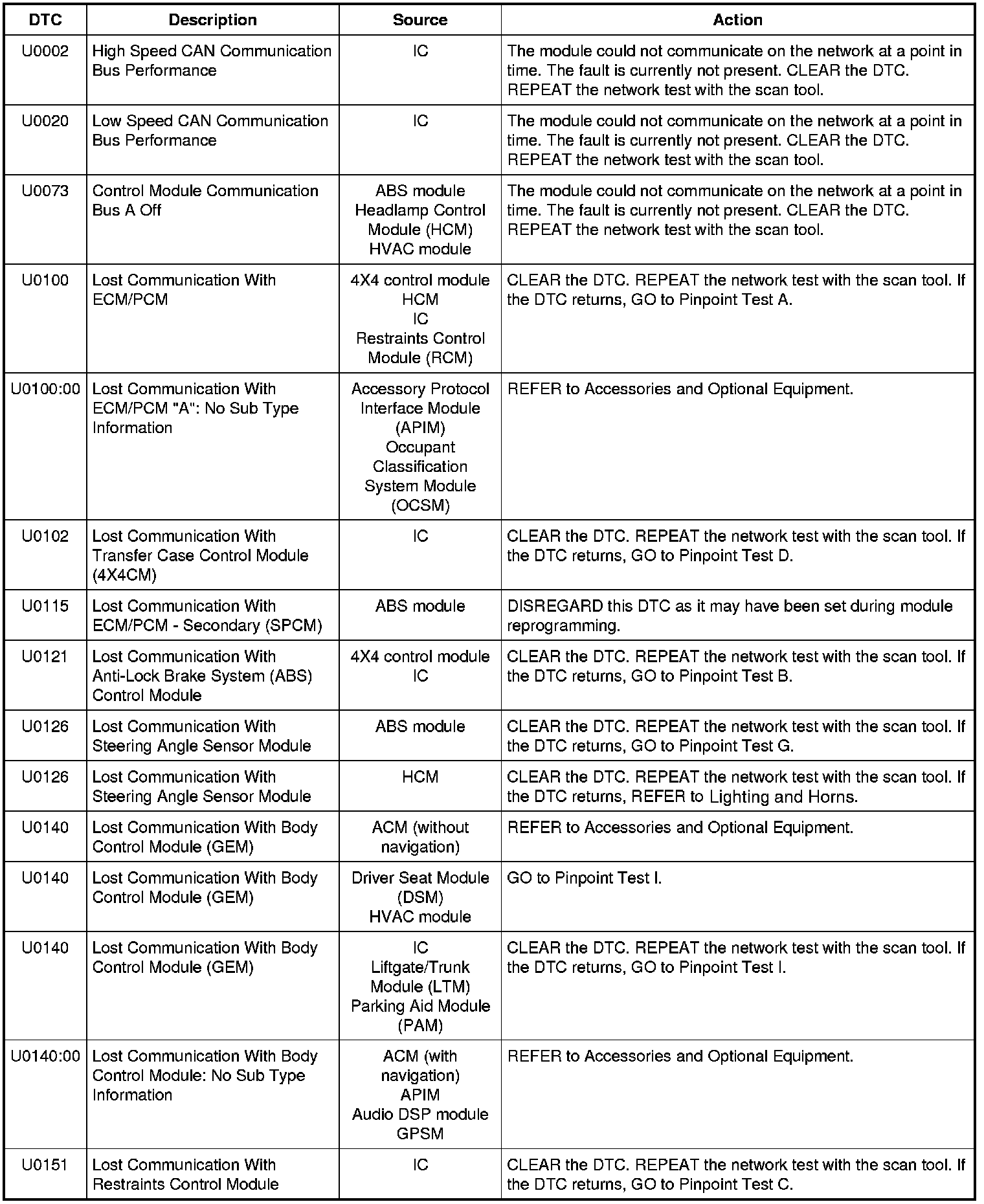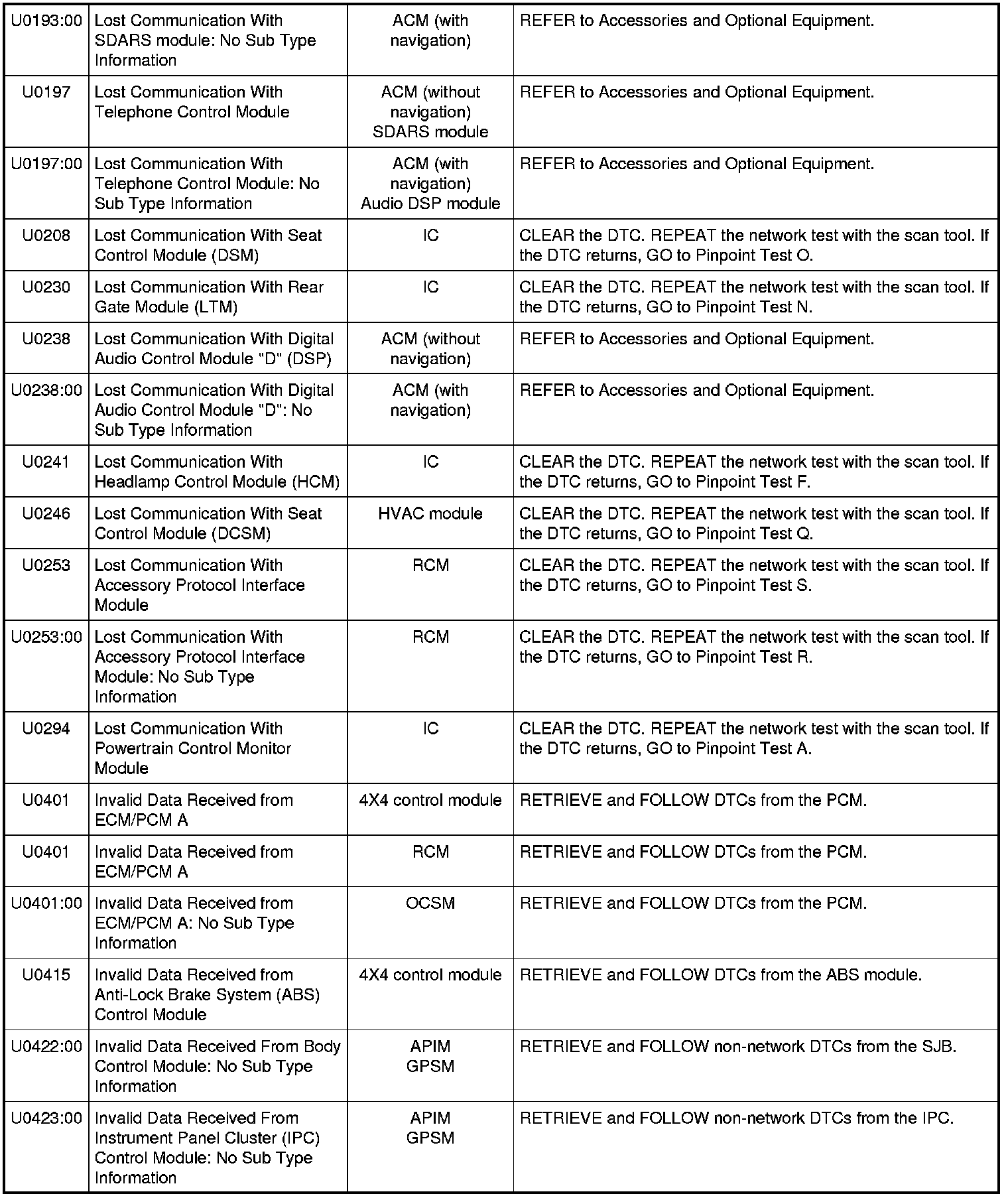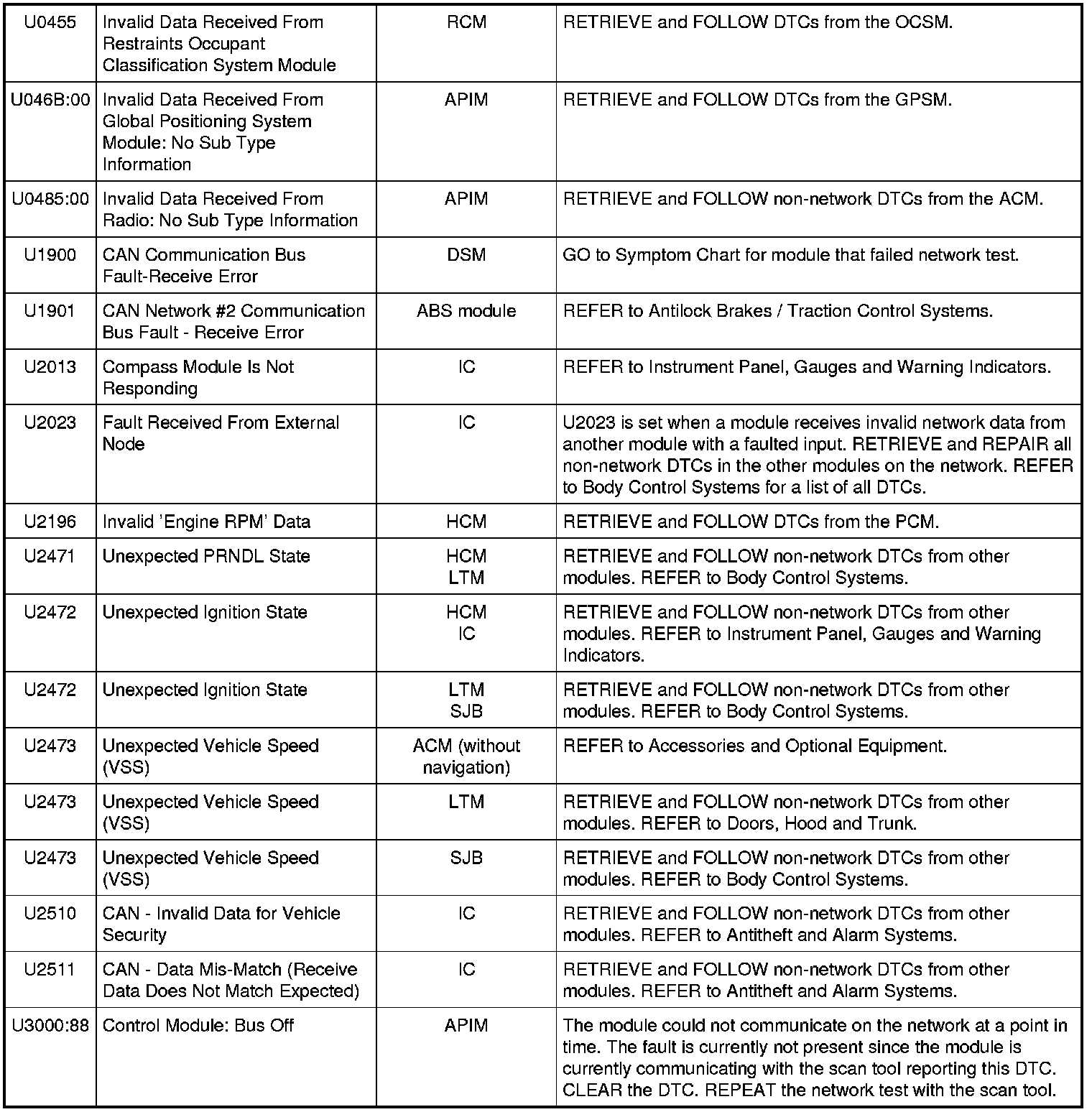 NOTE: Network DTCs (U-codes) are often a result of intermittent concerns such as damaged wiring or low battery voltage occurrences. Additionally, vehicle repair procedures such as module reprogramming often set network DTCs. Replacing a module to resolve a network DTC is unlikely to resolve the concern. To prevent repeat network DTC concerns, inspect all network wiring, especially connectors. Test the vehicle battery, refer to Battery.