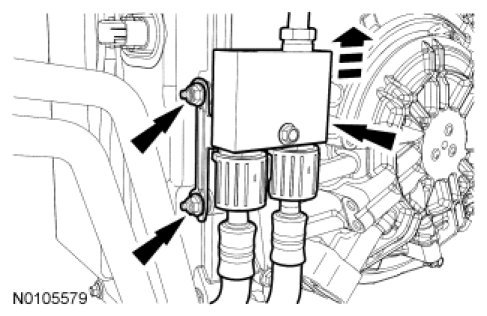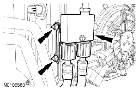 15. Remove the transmission fluid cooler tube bracket nuts, pull the transmission fluid cooler thermal bypass valve straight up and position it aside.