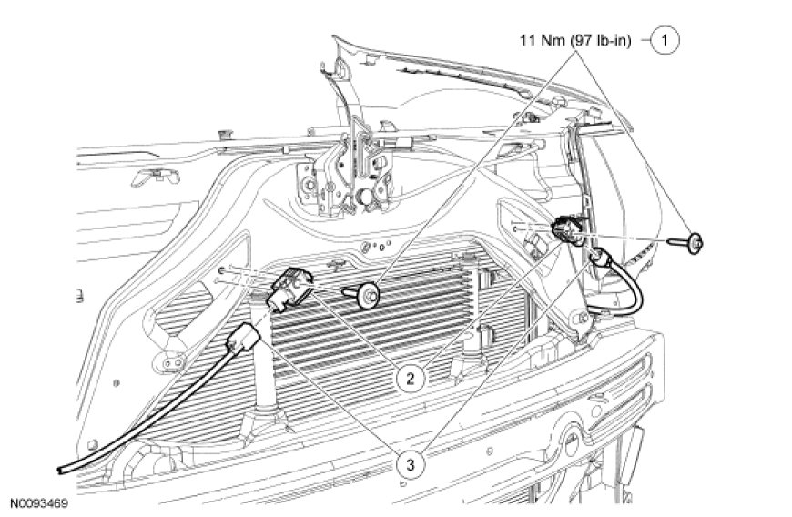 NOTE: Make sure the hood latch bracket and front impact severity sensor mating surfaces are clean and free of foreign material.