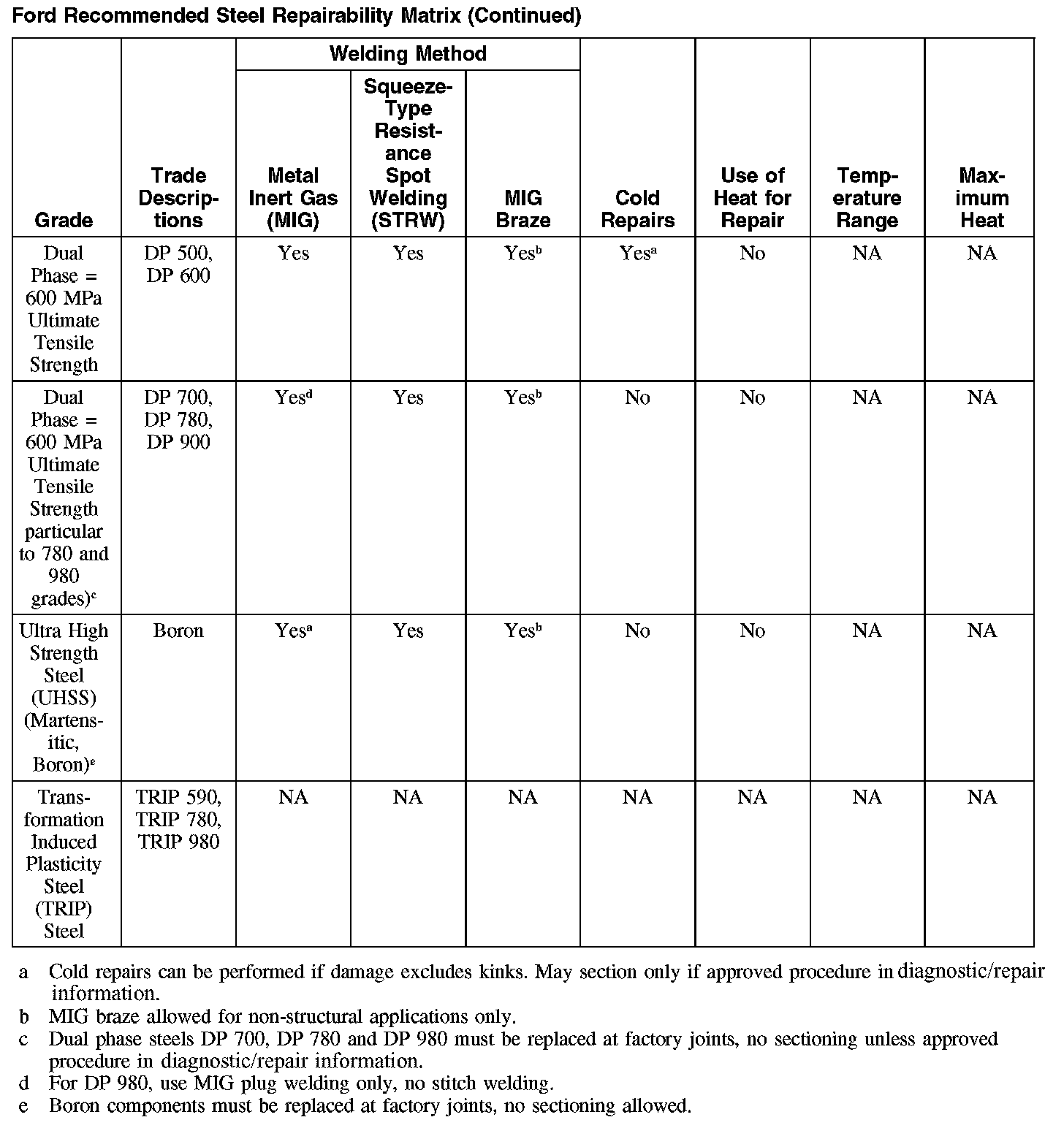 Ford Recommended Steel Repairability Matrix (Part 2):