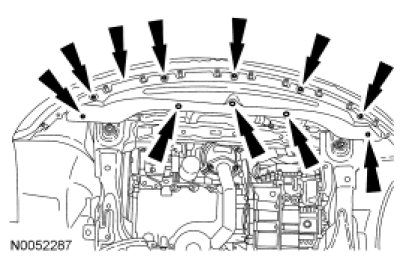 7. Position the transaxle in place and install the 7 torque converter housing bolts.