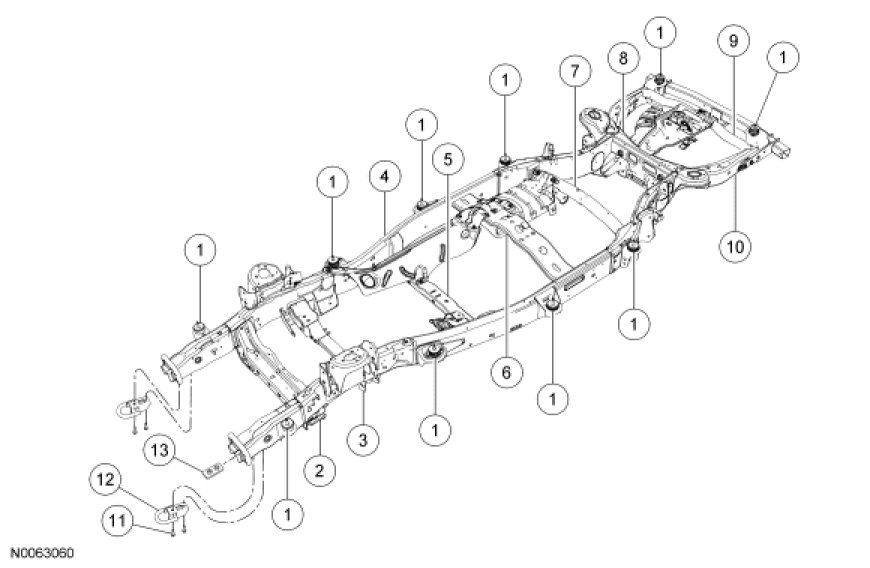 NOTICE: When removing upper body mounts, enough adjacent body mount support bolts or nuts must be removed to prevent damage occurring to the vehicle.