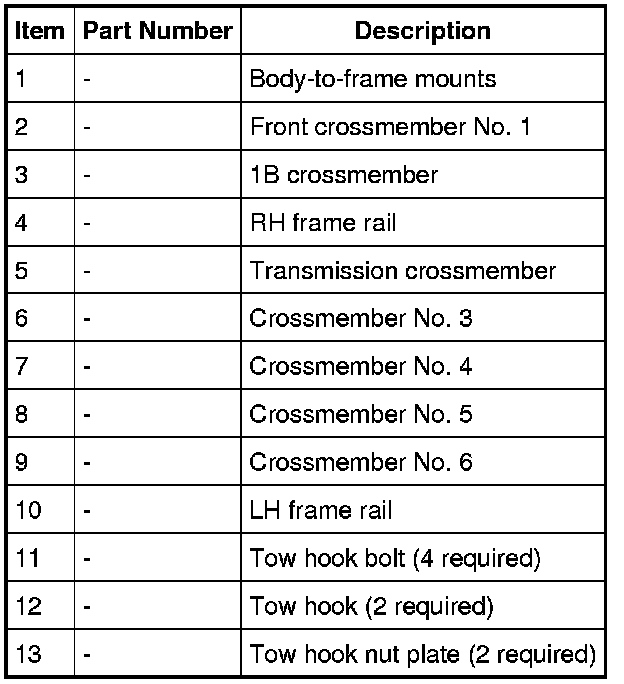 The frame is made up of 2 steel boxed side rails and crossmembers, which are welded to the 2 side rails. The transmission crossmember is bolted to the side rails. The side welded rails and crossmembers are not replaced separately.