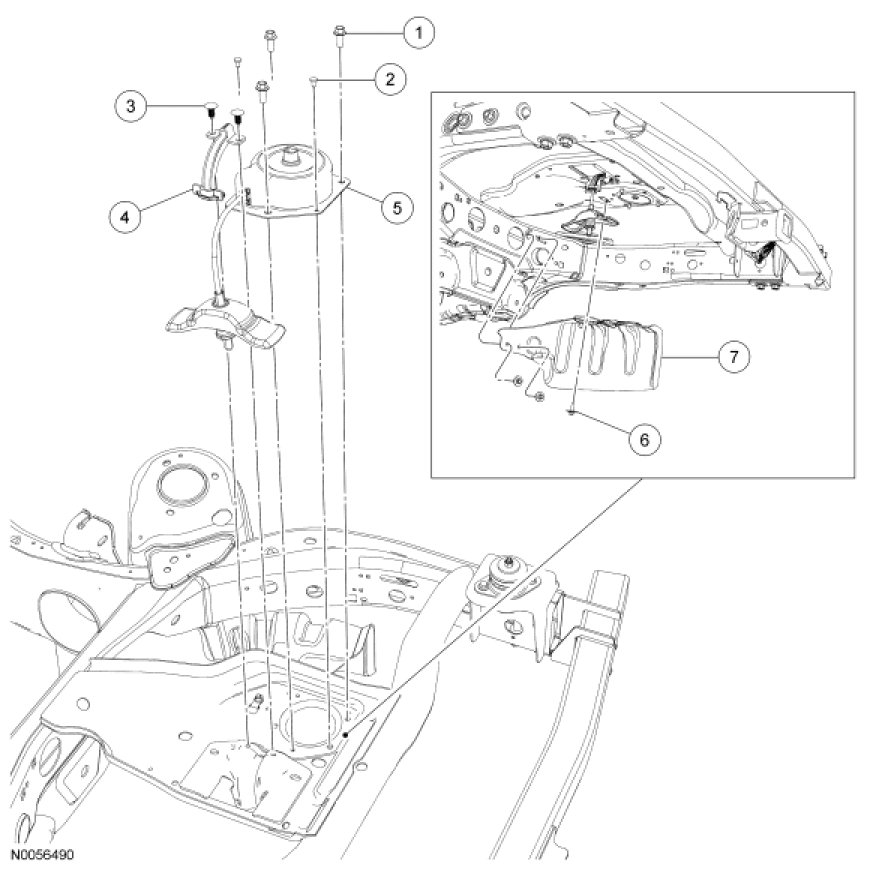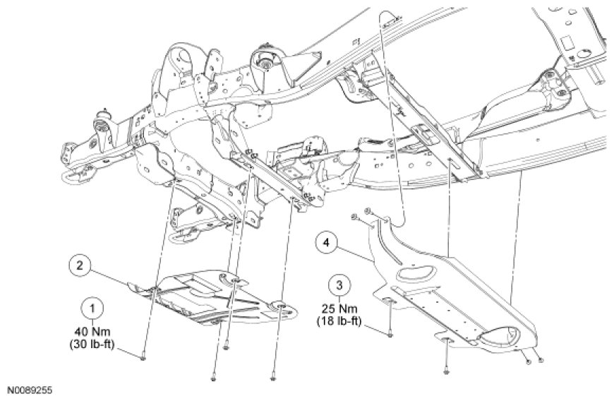 All frame-mounted heat shields, except the spare tire heat shield and the upper control arm heat shield, are tightened to 20 Nm (177 lb-in). The spare tire heat shield is tightened to 25 Nm (18 lb-ft). The upper control arm heat shield is tightened to 15 Nm (133 lb-in).