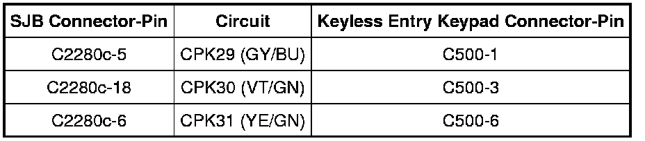 - Connect a fused jumper wire between the keyless entry keypad, harness side, while monitoring the SJB PID (KEY_PAD) as follows: