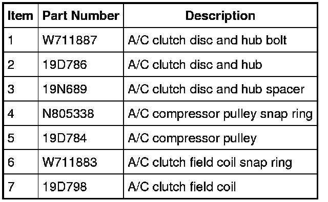 NOTE: Internal FS20 A/C compressor components are not serviced separately. The A/C compressor is serviced only as an assembly. The clutch disc and hub, A/C compressor pulley and bearing and clutch field coil are serviceable.