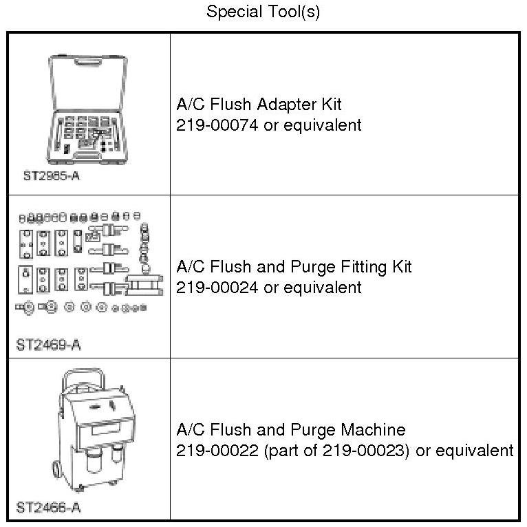NOTE: Ford Motor Company has approved a procedure to provide technicians with a non-CFC method of flushing contaminated A/C system heat exchangers. The procedure allows the specific components to be cleaned and flushed. The types of contamination flushed include particle matter that results from A/C compressor or desiccant failure and gummy residue that can form when refrigerant oil is overheated during A/C compressor seizure. The flushing process is a 2-step procedure that involves the use of an A/C Flush and Purge Machine 219-00022 to: