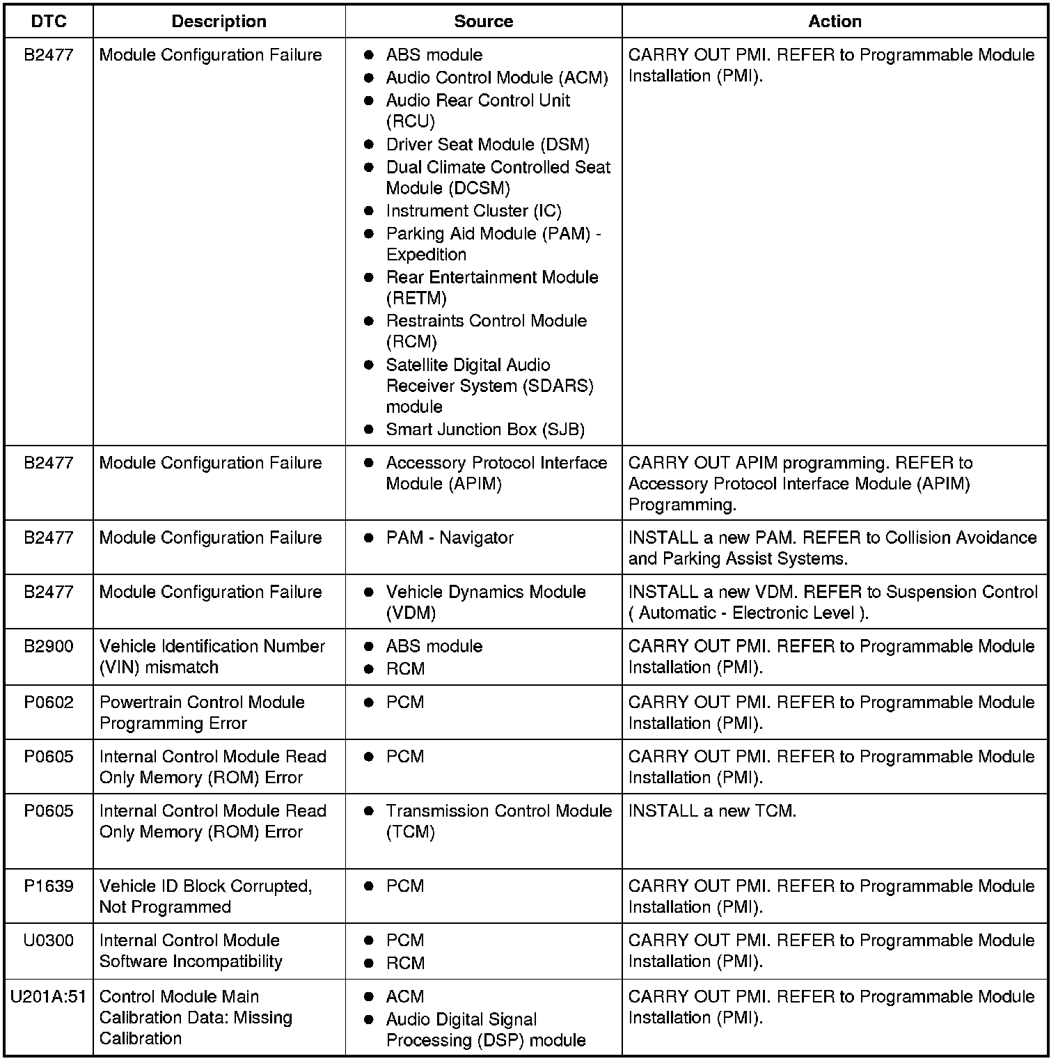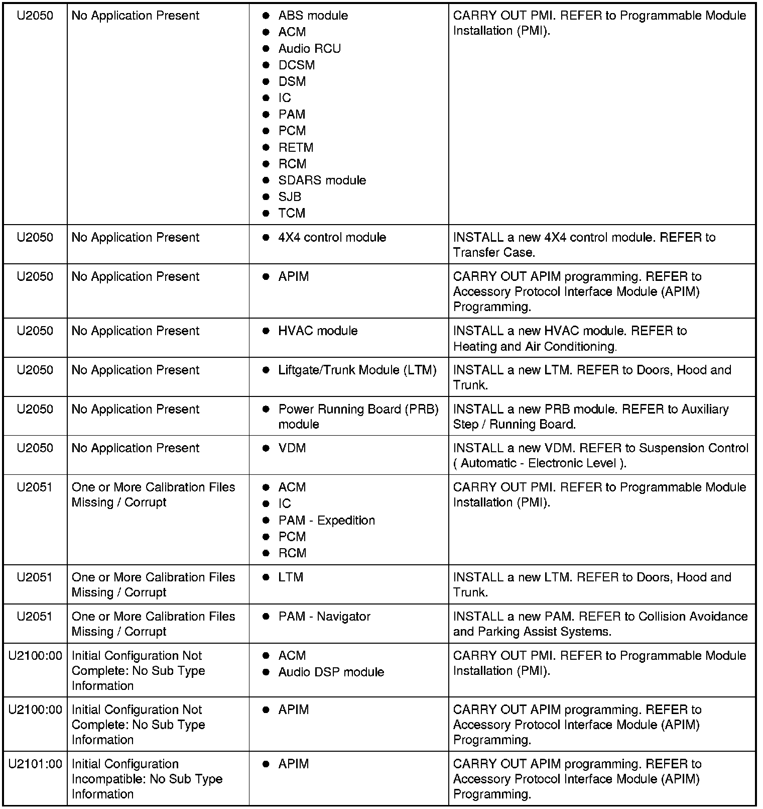 Module ConfigurationDTC ChartNOTE: Some modules on this vehicle utilize a 5-character DTC followed by a 2-character failure-type code. The failure-type code provides information about specific fault conditions such as opens, or shorts to ground. Continuous Memory DTCs have an additional 2-character DTC status code suffix to assist in determining DTC history.