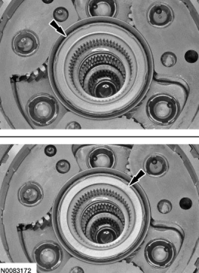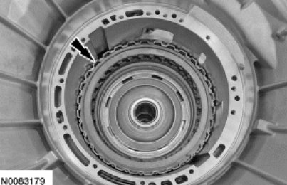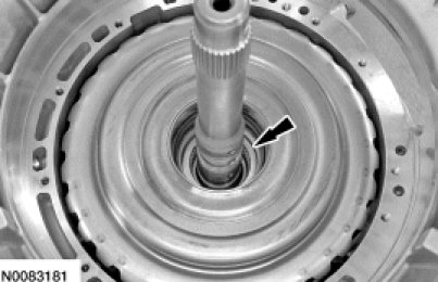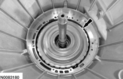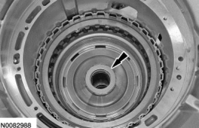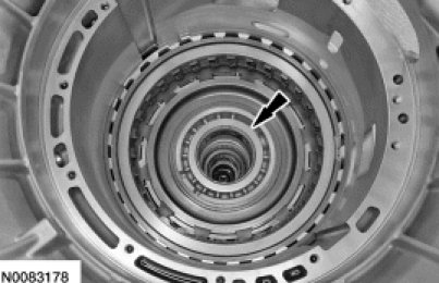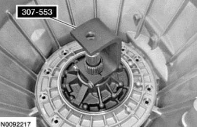 Using the Retaining Ring Pliers 307-343, install the center support snap ring. Using a suitable tool, be sure the snap ring is fully seated.