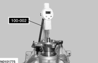 40. Install the Dial Indicator Gauge with Holding Fixture 100-002 on the transmission case and position the plunger on the output shaft flange.