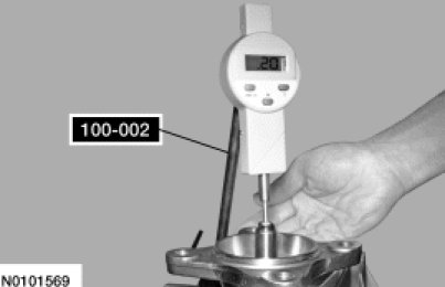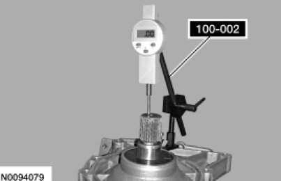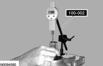 - Lift up on the Transmission End Play Gauge 307-534 and record the measurement on the Dial Indicator Gauge. The measurement should be between 0.2-0.4 mm (0.008-0.015 in). If the measurement is not within specification, install a new selective front pump washer.