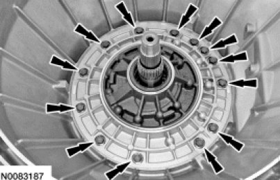 56. Install new front pump bolts with new washers. Tighten the bolts in a crisscross pattern.
