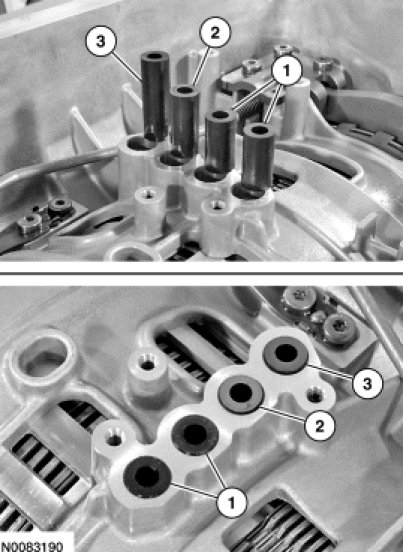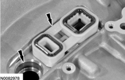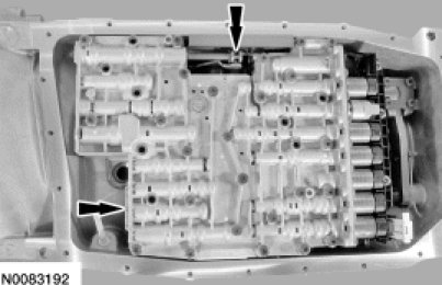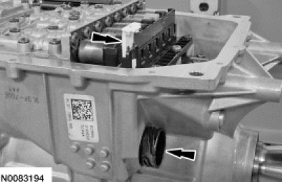 63. Align the mechatronic assembly guide pins in the alignment holes in the transmission case and position the mechatronic assembly in place.