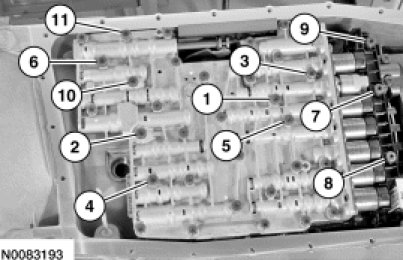 Install the mechatronic assembly bolts and tighten the bolts in the sequence shown.