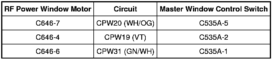 - Measure the resistance between RF power window motor C646, harness side and master window control switch C535A, harness side using the following chart: