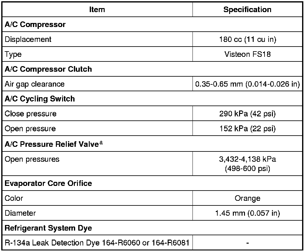 General Specificationsa Manifold gauge set pressures may vary slightly depending on the distance between the service gauge port valve and the A/C pressure relief valve or low charge protection switch.