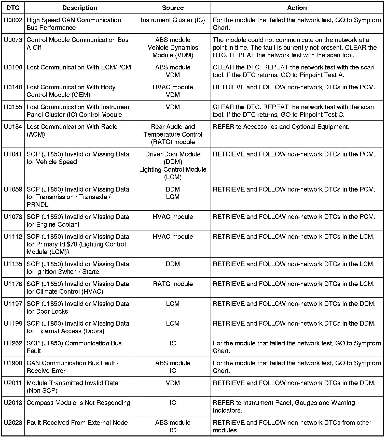 NOTE: Network DTCs (U-codes) are often a result of intermittent concerns such as damaged wiring or low battery voltage occurrences. Additionally, vehicle repair procedures such as module reprogramming often set network DTCs. Replacing a module to resolve a network DTC is unlikely to resolve the concern. To prevent repeat network DTC concerns, inspect all network wiring, especially connectors. Test the vehicle battery, refer to Battery.