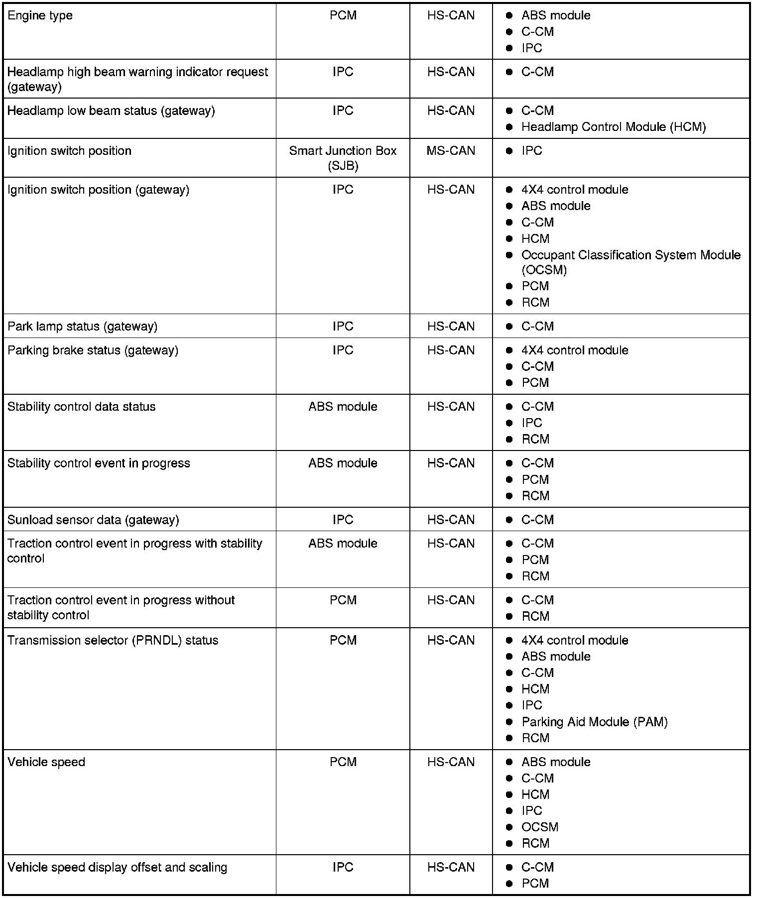 Controller Area Network (CAN) Module Communication Message Chart