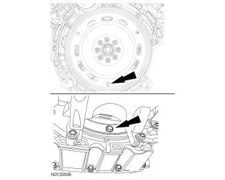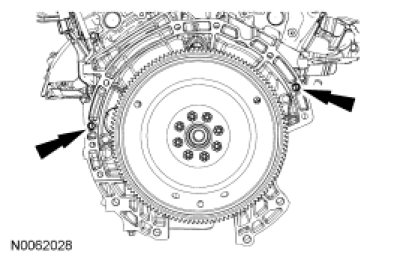 - Install the first torque converter bolt in the slotted hole on the flexplate.