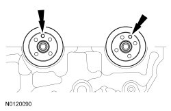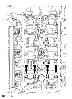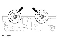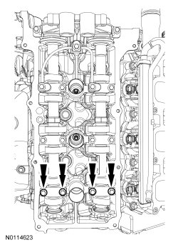 74. Install the 2 new LH VCT (Variable Camshaft Timing) bolts and tighten in 4 stages.