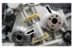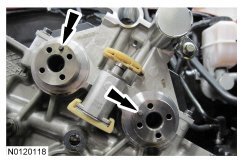 Position the 2 LH VCT (Variable Camshaft Timing) assemblies and secondary timing chain onto the camshafts by aligning the holes in the VCT (Variable Camshaft Timing) assemblies with the dowel pins in the camshafts.