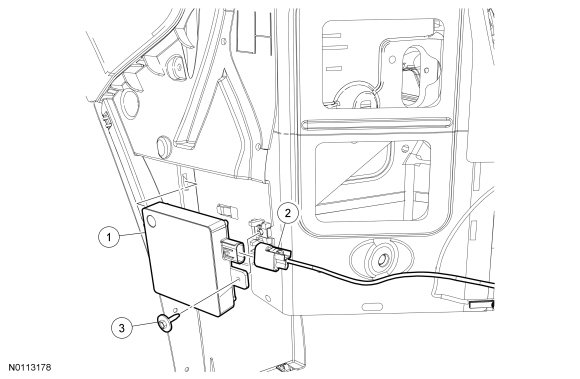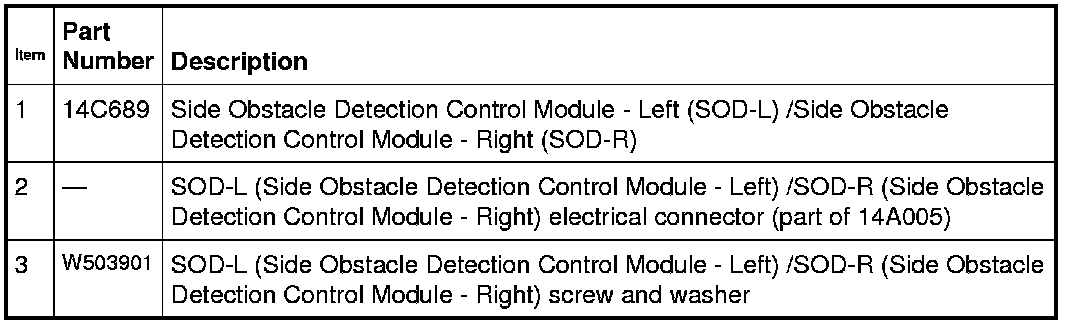 4. NOTE: The SOD-L (Side Obstacle Detection Control Module - Left) and the SOD-R (Side Obstacle Detection Control Module - Right) are not interchangeable. Make sure the replacement module is correct for the vehicle application.