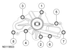 Tighten the coolant pump bolts in the sequence shown in 2 stages.