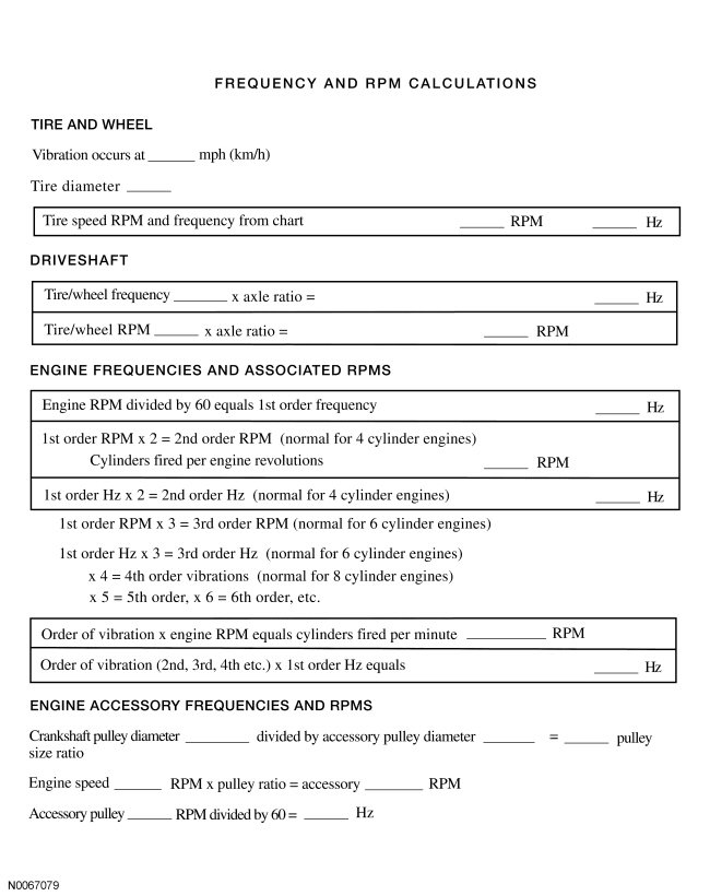 Use the engine rpm where the vibration symptom occurs to determine engine frequency. Calculate engine frequency by dividing the engine rpm by 60 (the number of seconds in a minute). For example, if the corresponding engine rpm of a vibration concern on a vehicle is 2,400 rpm, the resulting engine frequency is 40 Hz. Therefore, a 40 Hz vibration is a first order engine vibration. For purposes of vibration diagnosis, the engine also includes the torque converter and exhaust system.