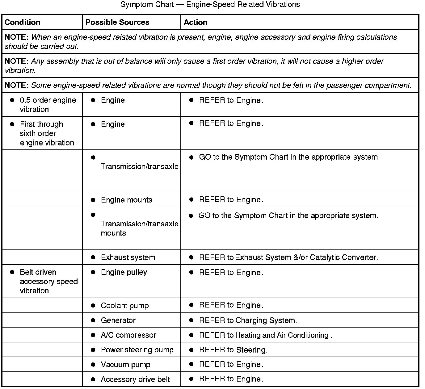 Use the diagnostic instructions along with the necessary listed tools to identify the vibration order and to isolate the symptom and the possible systems associated with that symptom. Then based on the results from the road test, make a determination of which action in the symptom chart to take first. Since it is possible any one of multiple systems may be the cause of the symptom, it may be necessary to use a process of elimination type diagnostic approach to pinpoint the concern. Refer to the system(s) indicated to identify and isolate the cause or rule that system out as being the causal system for the symptom.
