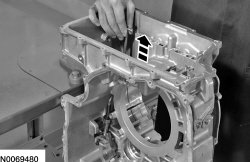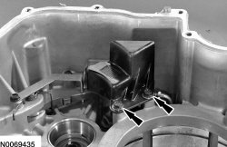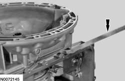 47. NOTICE: Carefully pry on the transaxle torque converter housing and the case to separate the torque converter housing from the case. Do not pry up on the silicone sealant mating surfaces, damage to the mating surfaces may occur. Carefully lift the torque converter housing off the dowel pins.