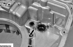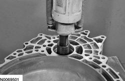 83. Using a suitable press, press the differential bearing cup out of the torque converter housing.