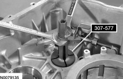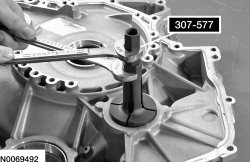62. If the transaxle case side differential bearing cup is damaged, install the Differential Bearing Cup Remover 307-586 on the bearing cup.