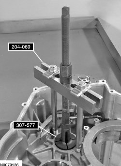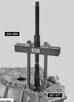 56. Install Front Wheel Hub Remover/Installer 204-069 and thread it into Transfer Gear Bearing Race Remover 307-577.
