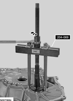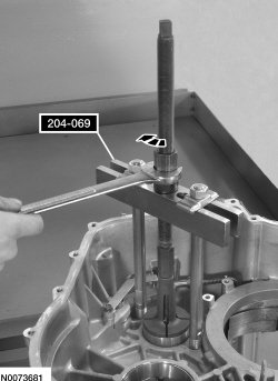 57. Using a wrench, turn the nut on Front Wheel Hub Remover/Installer 204-069 to remove the transfer shaft bearing cup from the transaxle case.