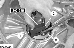 76. Install the Front Wheel Hub Remover/Installer 204-069 and thread it into Transfer Gear Bearing Race Remover 307-577.
