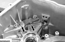 68. Using a magnet, remove the park pawl abutment pins and the abutment.