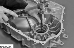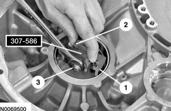 1. Position the Differential Bearing Cup Remover 307-586 in the torque converter housing with the tabs on the Differential Bearing Cup Remover 307-586 aligned with the slots in the transaxle case.