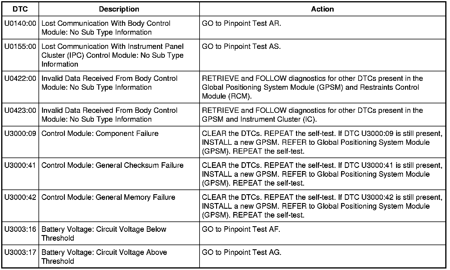 Global Positioning System Module (GPSM) DTC Chart