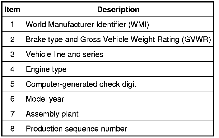 The fourth VIN position is the vehicle brake type and Gross Vehicle Weight Rating (GVWR) code. All vehicles use hydraulic brakes.