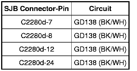 - Measure the voltage between the SJB C2280G-1, circuit SDC04 (RD), harness side and ground.