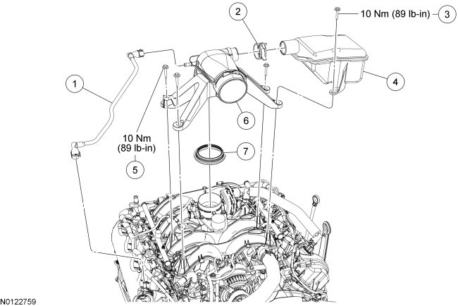 17. Position the crankcase ventilation tube and connect the quick connect couplings. For additional information, refer to Fuel System - General Information Quick Connect Coupling.