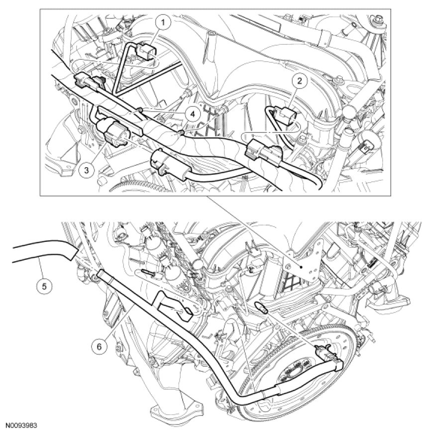 12. Disconnect the 4 LH ignition coil and the LH Variable Camshaft Timing (VCT) solenoid electrical connectors and detach the 2 engine wiring harness retainers from the LH valve cover studs.