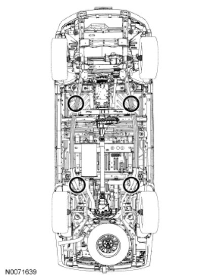 NOTICE: Damage to the suspension, exhaust or steering linkage components may occur if care is not exercised when positioning the hoist adapters prior to lifting the vehicle.