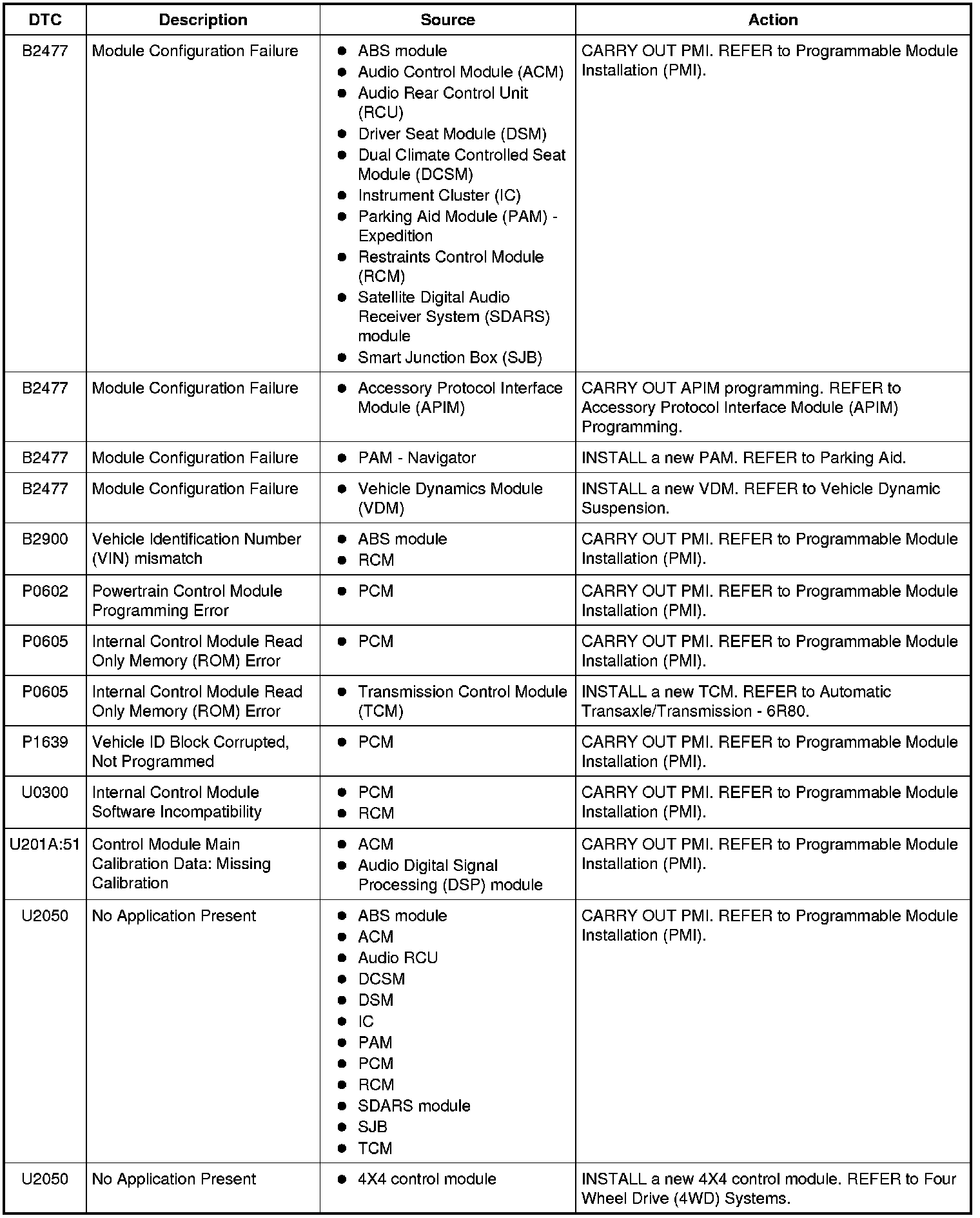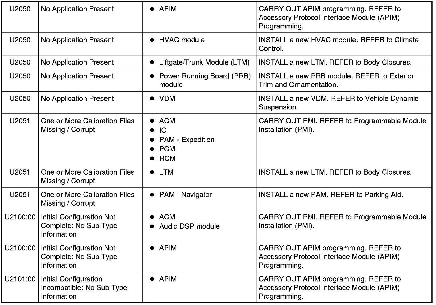 Module ConfigurationDTC Chart NOTE: Some modules on this vehicle utilize a 5-character DTC followed by a 2-character failure-type code. The failure-type code provides information about specific fault conditions such as opens, or shorts to ground. Continuous Memory DTCs have an additional 2-character DTC status code suffix to assist in determining DTC history.