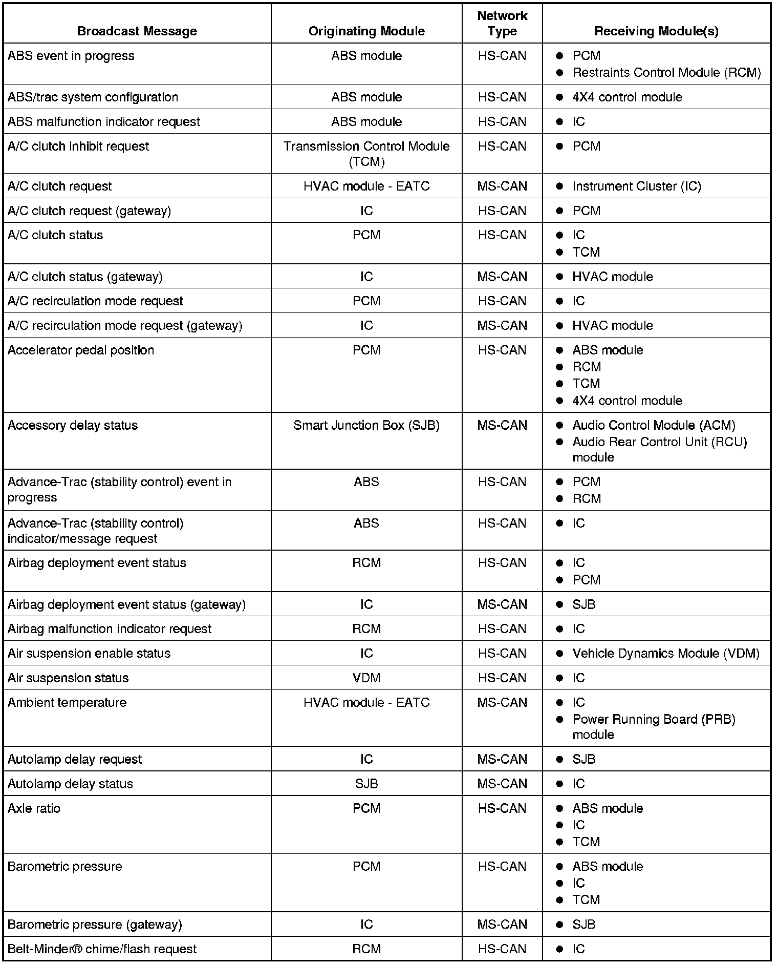 NOTE: This chart describes the specific HS-CAN and MS-CAN messages broadcast by each module, and the module(s) that receive the message.