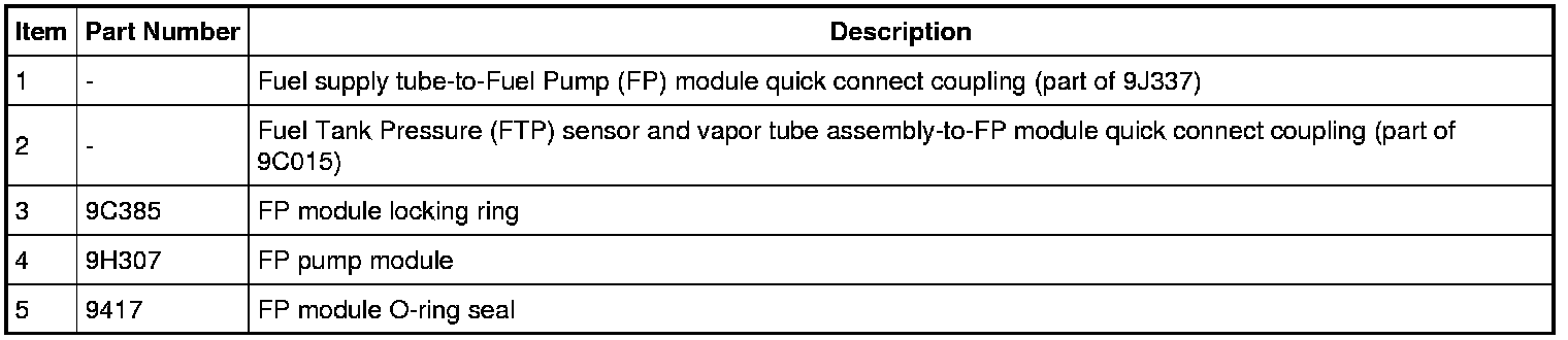 3. Disconnect the Fuel Tank Pressure (FTP) sensor and vapor tube assembly-to-FP module quick connect coupling and the supply fuel tube-to-FP module quick connect coupling. For additional information, refer to Fuel System - General Information Quick Connect Coupling.